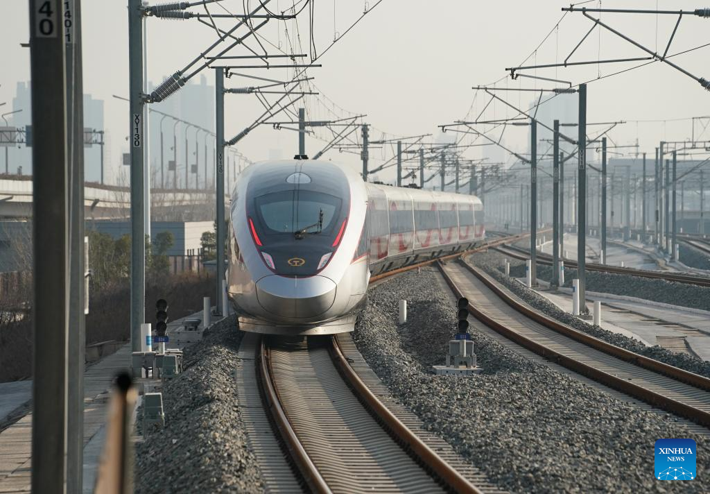 XI'AN, 26 diciembre, 2025 (Xinhua) -- El C9312, el primer tren de línea ferroviaria de alta velocidad Xi'an-Yan'an con destino a Yan'an, parte de la Estación de Ferrocarril del Norte de Xi'an, en Xi'an, en la provincia de Shaanxi, en el noroeste de China, el 26 de diciembre de 2025. Un estilizado tren bala plateado partió el viernes de Yan'an, en la provincia noroccidental china de Shaanxi, para conectar así el sagrado corazón revolucionario de China con la red ferroviaria de alta velocidad del país, que se encuentra en rápida expansión. (Xinhua/Shao Rui)
