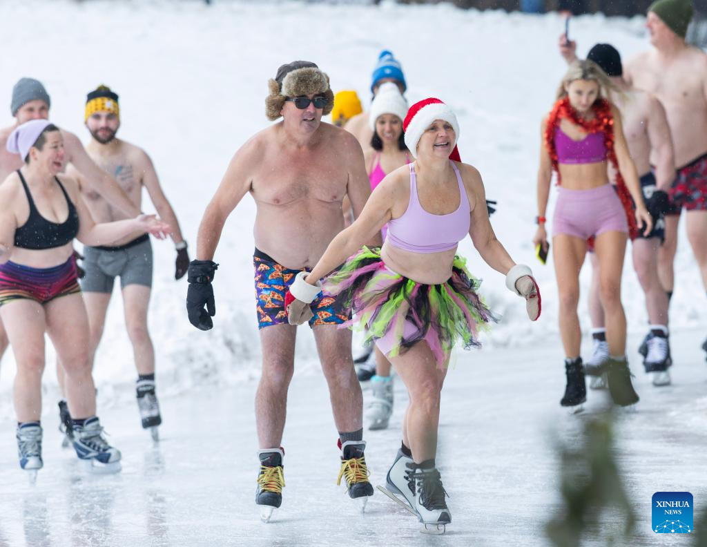 TORONTO, 29 diciembre, 2025 (Xinhua) -- Imagen del 28 de diciembre de 2025 de personas portando traje de baño mientras participan en el evento Patinaje del Oso Polar de Toronto 2025, en Toronto, Canadá. Alrededor de 160 patinadores participaron el domingo en este evento anual para despedir el año 2025. (Xinhua/Zou Zheng)