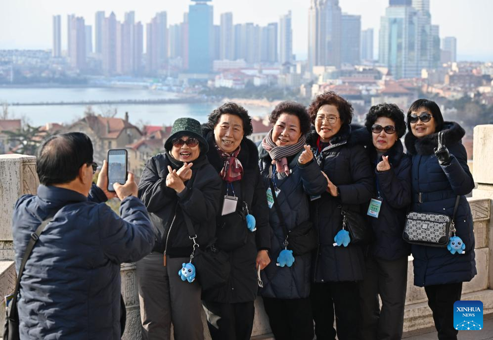 QINGDAO, 1 enero, 2026 (Xinhua) -- Imagen del 31 de diciembre de 2025 de turistas de República de Corea posando para fotografías en el punto escénico de Xiaoyushan, en la ciudad de Qingdao, en la provincia de Shandong, en el este de China. Un grupo de más de 100 turistas de República de Corea llegó a Qingdao el miércoles para el viaje de Año Nuevo con itinerarios que incluyen atención médica, visitas turísticas a puntos escénicos y distritos comerciales, y actividades culturales. (Xinhua/Li Ziheng)