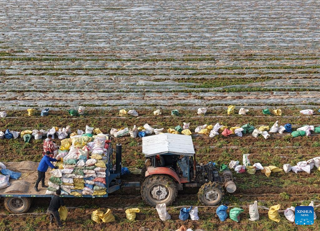BEIJING, 5 enero, 2026 (Xinhua) -- Vista aérea tomada con un dron el 5 de enero de 2026 de agricultores cosechando zanahorias en un campo, en el distrito de Wenxian de la ciudad de Jiaozuo, en la provincia de Henan, en el centro de China. El Frío Menor, también conocido como "Xiao Han" en chino, es el vigésimo tercer de los veinticuatro términos solares del calendario lunar chino y este año cae en lunes. Durante el Frío Menor, la mayoría de las áreas de China han entrado en la etapa de frío intenso del invierno. (Xinhua/Xu Hongxing)