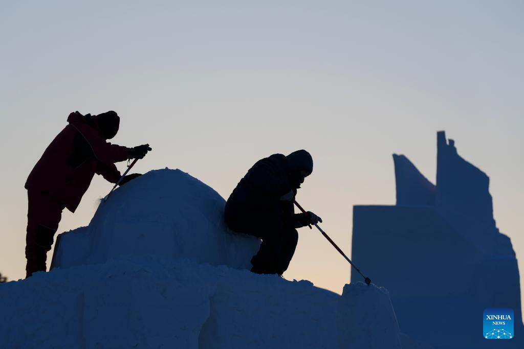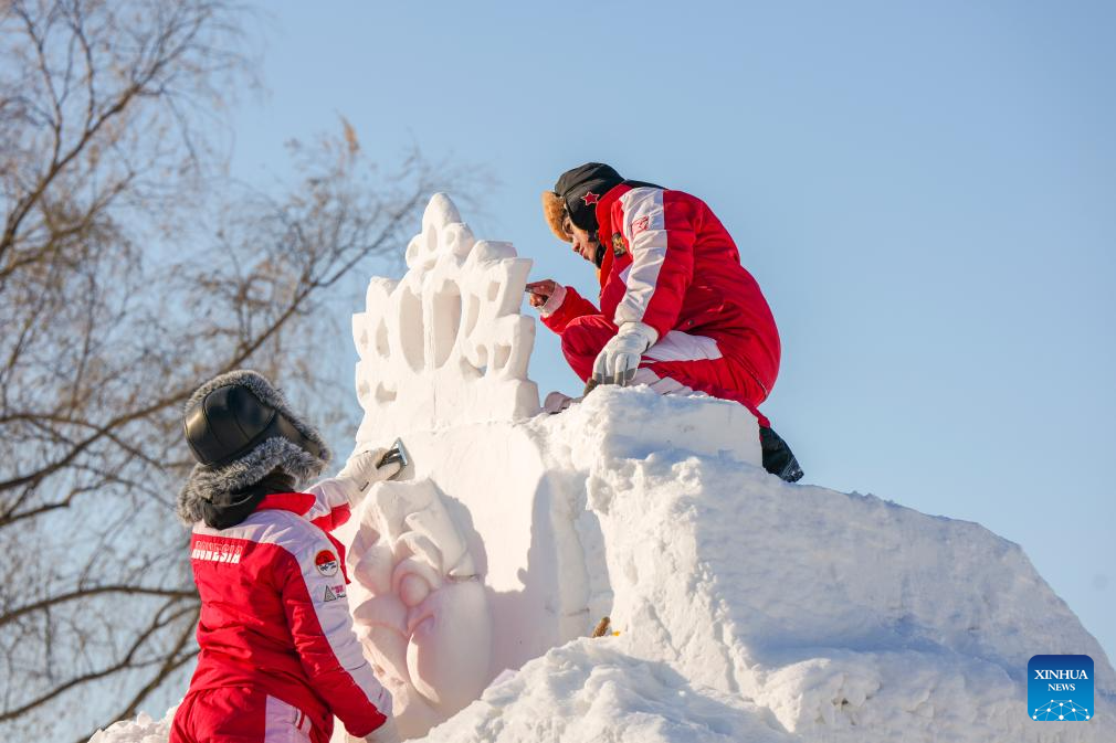 HARBIN, 7 enero, 2026 (Xinhua) -- Concursantes trabajan en una escultura de nieve en el recinto de la Exposición Internacional de Arte de Esculturas de Nieve de la Isla del Sol, en Harbin, en la provincia de Heilongjiang, en el noreste de China, el 7 de enero de 2026. El 28 concurso internacional de esculturas de nieve de Harbin comenzó aquí el martes, atrayendo 25 equipos de escultores de nieve de 13 países. Diversos trabajos de esculturas de nieve comenzaron a tomar forma el miércoles. (Xinhua/Wang Song)