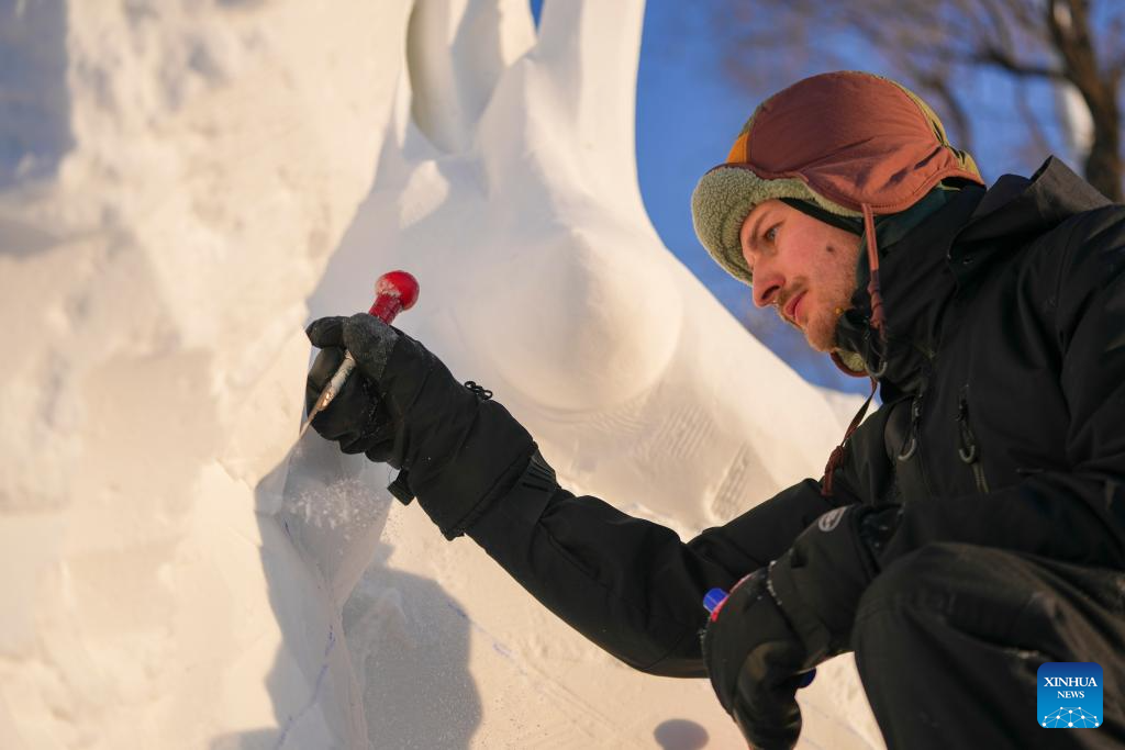 HARBIN, 7 enero, 2026 (Xinhua) -- Un concursante trabaja en una escultura de nieve en el recinto de la Exposición Internacional de Arte de Esculturas de Nieve de la Isla del Sol, en Harbin, en la provincia de Heilongjiang, en el noreste de China, el 7 de enero de 2026. El 28 concurso internacional de esculturas de nieve de Harbin comenzó aquí el martes, atrayendo 25 equipos de escultores de nieve de 13 países. Diversos trabajos de esculturas de nieve comenzaron a tomar forma el miércoles. (Xinhua/Zhang Tao)