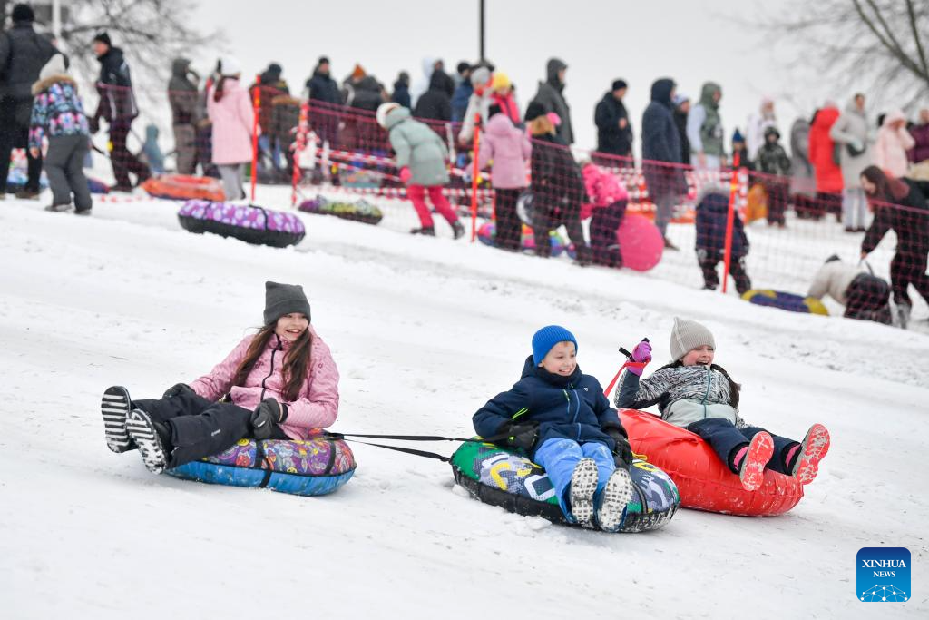 MOSCU, 7 enero, 2026 (Xinhua) -- Personas disfrutan deslizarse en trineo por la nieve en un parque, en Moscú, Rusia, el 7 de enero de 2026. (Xinhua/Alexander Zemlianichenko Jr)
