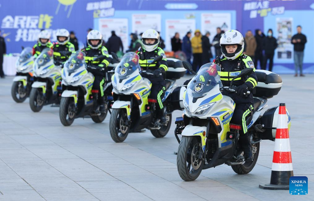 BEIJING, 10 enero, 2026 (Xinhua) -- Oficiales de policía demuestran habilidades de conducción de motocicletas, en Shijiazhuang, en la provincia de Hebei, en el norte de China, el 10 de enero de 2026. Diversas actividades se llevaron a cabo a nivel nacional para conmemorar el sexto Día de la Policía Popular China. (Xinhua/Liang Zidong)