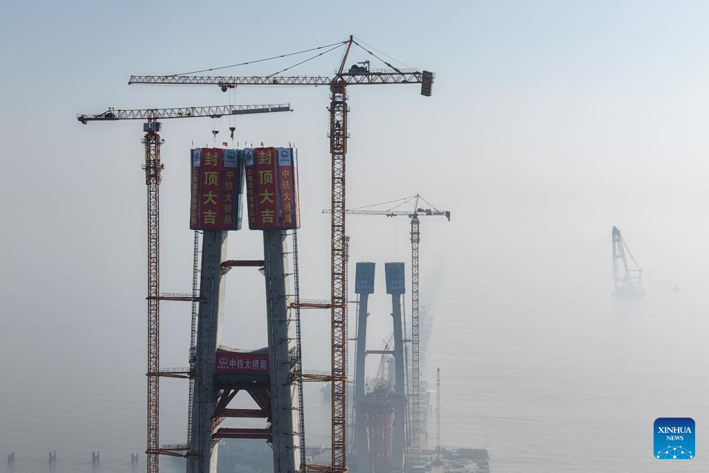 HAIYAN, 16 enero, 2026 (Xinhua) -- Imagen tomada con un dron el 16 de enero de 2026 de la torre principal No. 8 del puente del canal de navegación norte a lo largo del Puente Ferroviario Transmarino de la Bahía de Hangzhou, en la provincia de Zhejiang, en el este de China. La torre principal No. 8 de 200 metros de altura del puente del canal de navegación norte a lo largo del Puente Ferroviario Transmarino de la Bahía de Hangzhou fue coronada el viernes. (Xinhua/Huang Zongzhi)