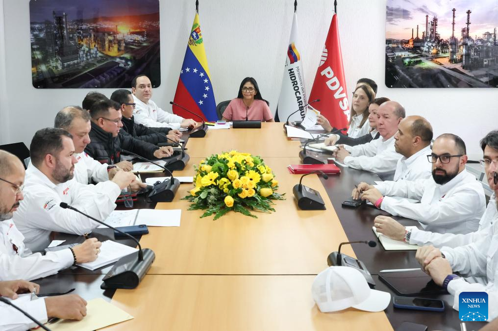 ANZOATEGUI, 25 enero, 2026 (Xinhua) -- Imagen proveída por la Presidencia de Venezuela de la presidenta encargada venezolana, Delcy Rodríguez (c), participando en una reunión en Puerto La Cruz, en el estado Anzoátegui, Venezuela, el 25 de enero de 2026. La reforma de la Ley Orgánica de Hidrocarburos que impulsa el Gobierno de Venezuela servirá para la "felicidad económica" del país, afirmó el domingo la presidenta encargada, Delcy Rodríguez. (Xinhua/Presidencia de Venezuela)