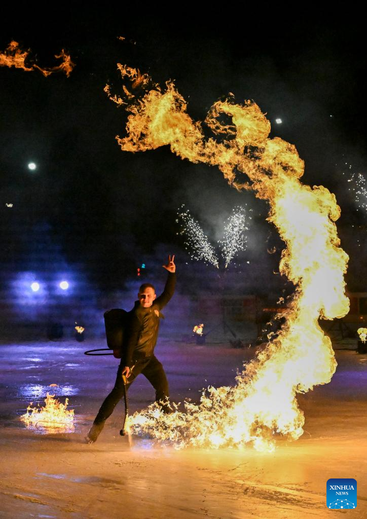 MOSCU, 25 enero, 2026 (Xinhua) -- Imagen del 24 de enero de 2026 de un artista realizando una presentación durante un espectáculo llamado "Hielo en llamas" en una pista de hielo de un parque, en Moscú, Rusia. (Xinhua/Hao Jianwei)