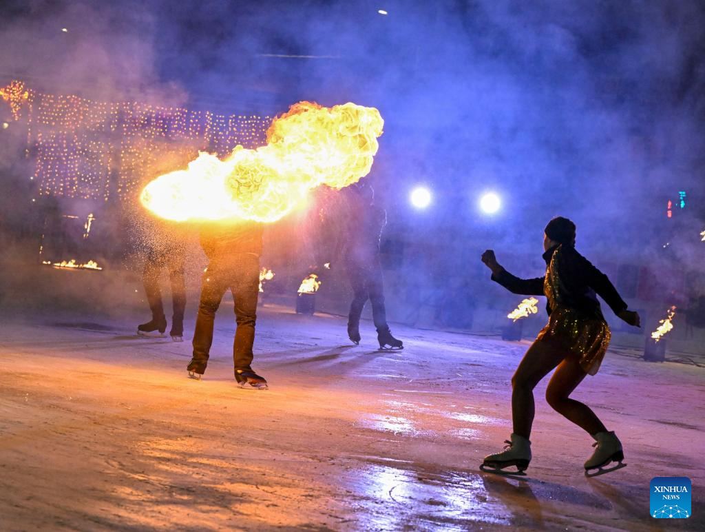 MOSCU, 25 enero, 2026 (Xinhua) -- Imagen del 24 de enero de 2026 de artistas realizando una presentación durante un espectáculo llamado "Hielo en llamas" en una pista de hielo de un parque, en Moscú, Rusia. (Xinhua/Hao Jianwei)