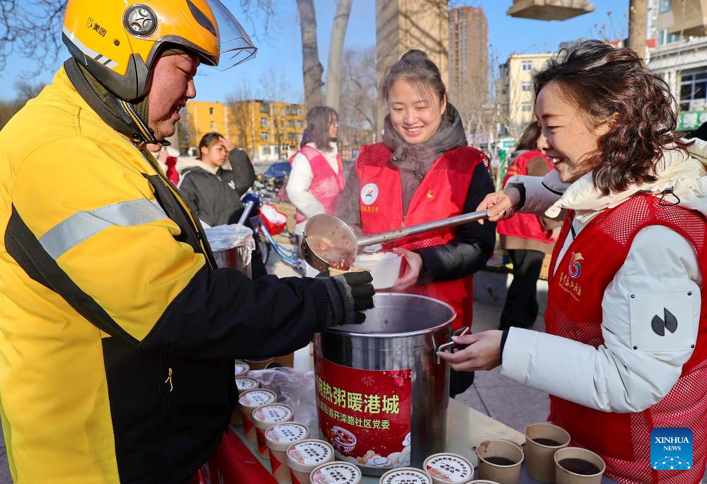 BEIJING, 26 enero, 2026 (Xinhua) -- Imagen del 25 de enero de 2026 de voluntarias sirviendo gachas de Laba a un repartidor de comida, en el distrito de Haigang de Qinhuangdao, en la provincia de Hebei, en el norte de China. Diversas actividades se llevaron a cabo en todo el país para celebrar el Festival Laba que cae el 26 de enero de este año. (Xinhua/Cao Jianxiong)