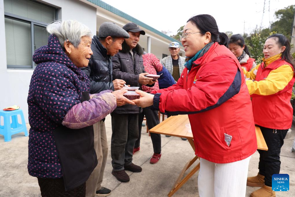 BEIJING, 26 enero, 2026 (Xinhua) -- Imagen del 25 de enero de 2026 de voluntarias sirviendo gachas de Laba a personas mayores residentes, en el distrito de Dinghai de Zhoushan, en la provincia de Zhejiang, en el este de China. Diversas actividades se llevaron a cabo en todo el país para celebrar el Festival Laba que cae el 26 de enero de este año. (Xinhua/Chen Yongjian)