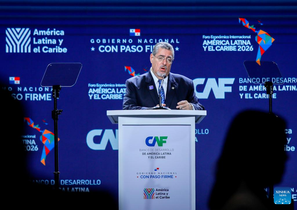 CIUDAD DE PANAMA, 28 enero, 2026 (Xinhua) -- El presidente guatemalteco, Bernardo Arévalo, pronuncia un discurso durante el Foro Económico Internacional América Latina y el Caribe 2026 del Banco de Desarrollo de América Latina y el Caribe (CAF), en la Ciudad de Panamá, capital de Panamá, el 28 de enero de 2026. El Foro Económico Internacional América Latina y el Caribe 2026 del CAF se desarrolla en Panamá y cuenta con la participación de mandatarios y delegaciones de distintos países de América Latina y el Caribe, en un contexto marcado por la búsqueda de nuevas estrategias de cooperación e inserción regional en la economía global. (Xinhua/Daniel González)