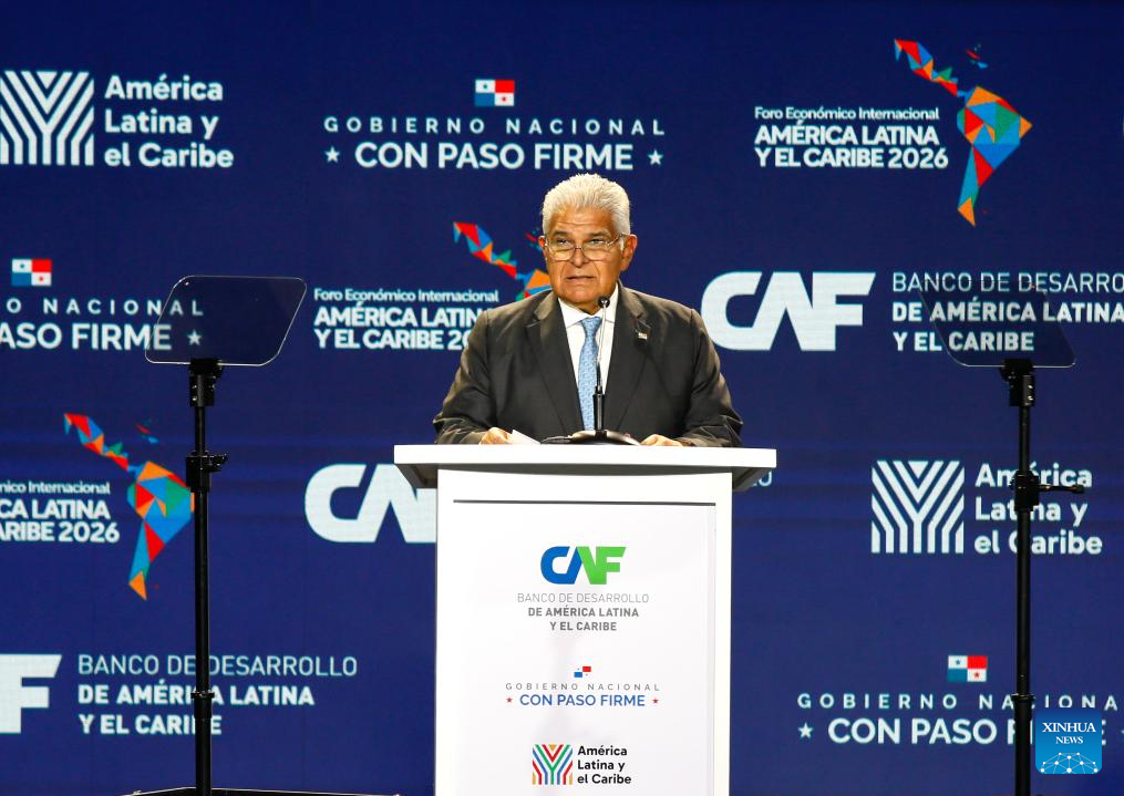 CIUDAD DE PANAMA, 28 enero, 2026 (Xinhua) -- El presidente panameño, José Raúl Mulino, pronuncia un discurso durante el Foro Económico Internacional América Latina y el Caribe 2026 del Banco de Desarrollo de América Latina y el Caribe (CAF), en la Ciudad de Panamá, capital de Panamá, el 28 de enero de 2026. El Foro Económico Internacional América Latina y el Caribe 2026 del CAF se desarrolla en Panamá y cuenta con la participación de mandatarios y delegaciones de distintos países de América Latina y el Caribe, en un contexto marcado por la búsqueda de nuevas estrategias de cooperación e inserción regional en la economía global. (Xinhua/Daniel González)