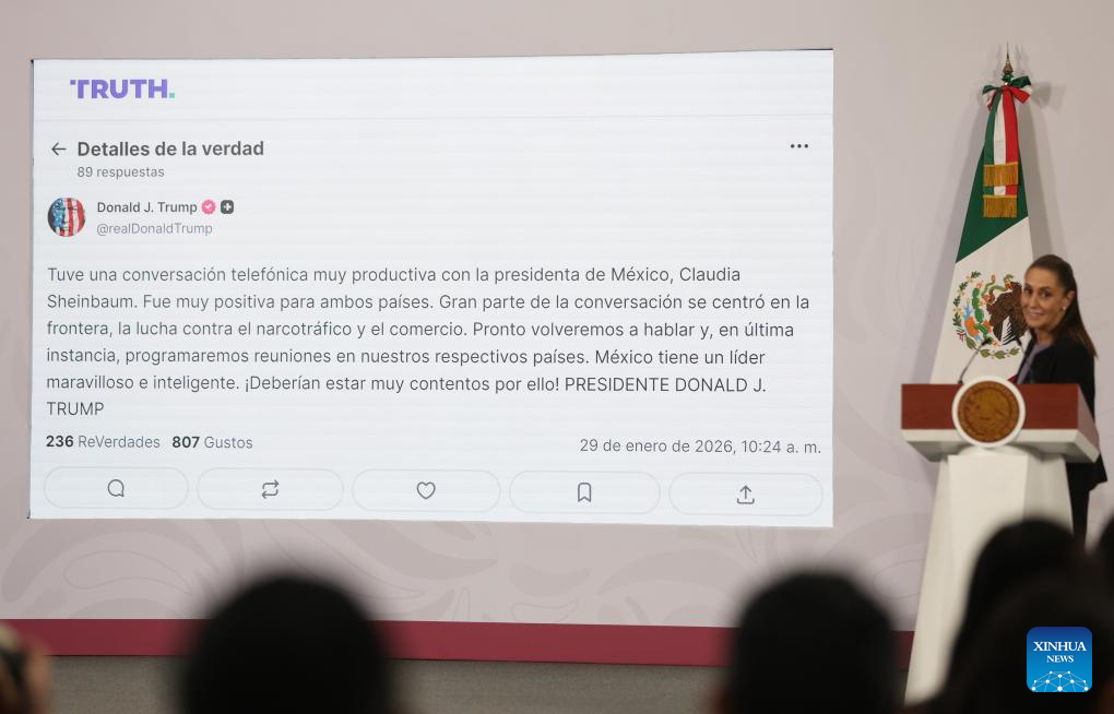 MÉXICO, 29 ene (Xinhua) -- La presidenta de México, Claudia Sheinbaum, dio a conocer hoy jueves que mantuvo una llamada telefónica con su par de Estados Unidos, Donald Trump, en la que abordaron temas comerciales y relevantes de la relación entre ambas naciones.
