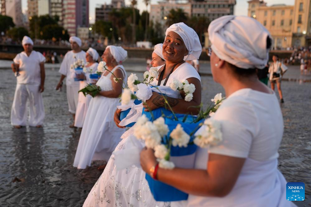 MONTEVIDEO, 3 febrero, 2026 (Xinhua) -- Imagen del 2 de febrero de 2026 de personas participando durante la celebración de Iemanjá, en la playa Ramírez, en Montevideo, capital de Uruguay. (Xinhua/Nicolás Celaya)