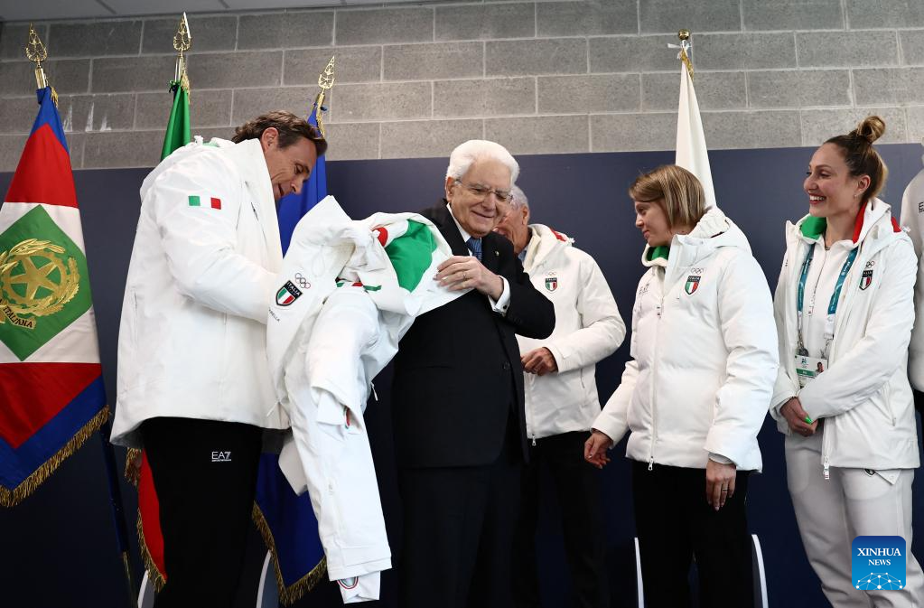 MILAN, 5 febrero, 2026 (Xinhua) -- El presidente italiano, Sergio Mattarella, se coloca una chamarra olímpica italiana durante su visita a la Villa Olímpica previo a los Juegos Olímpicos de Invierno Milán-Cortina 2026, en Milán, Italia, el 5 de febrero de 2026. (Xinhua/Yara Nardi/Pool)