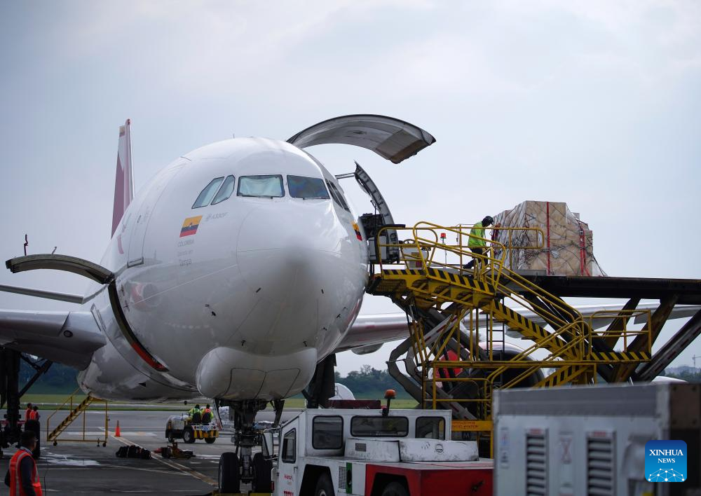 BOGOTA, 11 febrero, 2026 (Xinhua) -- Imagen del 10 de febrero de 2026 de un trabajador transportando cajas con flores colombianas al interior de un avión de carga en la terminal de carga del Aeropuerto Internacional El Dorado, en Bogotá, capital de Colombia. El gremio floricultor de Colombia ha reportado como exitosas sus operaciones de exportación durante la temporada de San Valentín, a pesar del incremento de los aranceles para ese producto colombiano, ordenado por el Gobierno de Estados Unidos en abril del pasado año. (Xinhua/Andrés Moreno)