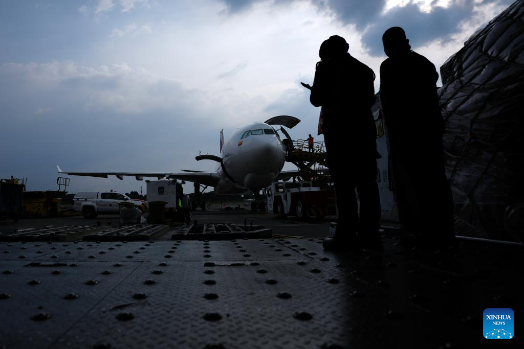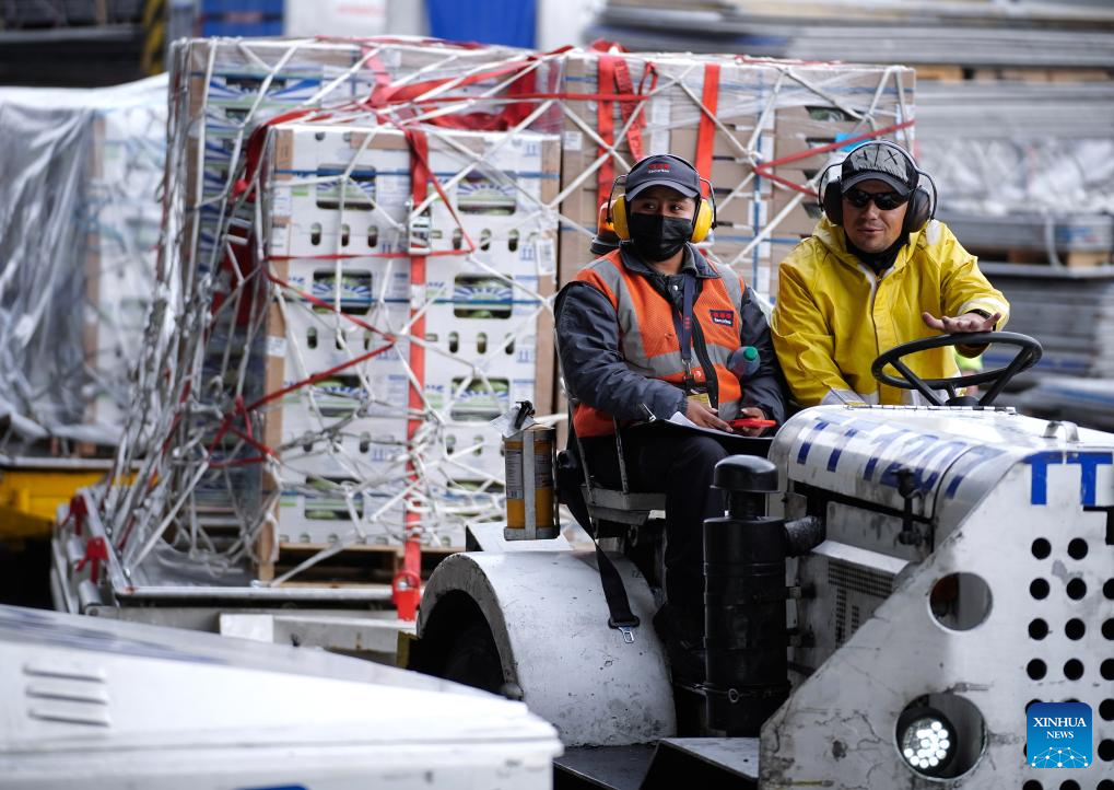 BOGOTA, 11 febrero, 2026 (Xinhua) -- Imagen del 10 de febrero de 2026 de trabajadores realizando labores de carga y transporte de flores en la terminal de carga del Aeropuerto Internacional El Dorado, en Bogotá, capital de Colombia. El gremio floricultor de Colombia ha reportado como exitosas sus operaciones de exportación durante la temporada de San Valentín, a pesar del incremento de los aranceles para ese producto colombiano, ordenado por el Gobierno de Estados Unidos en abril del pasado año.(Xinhua/Andrés Moreno)