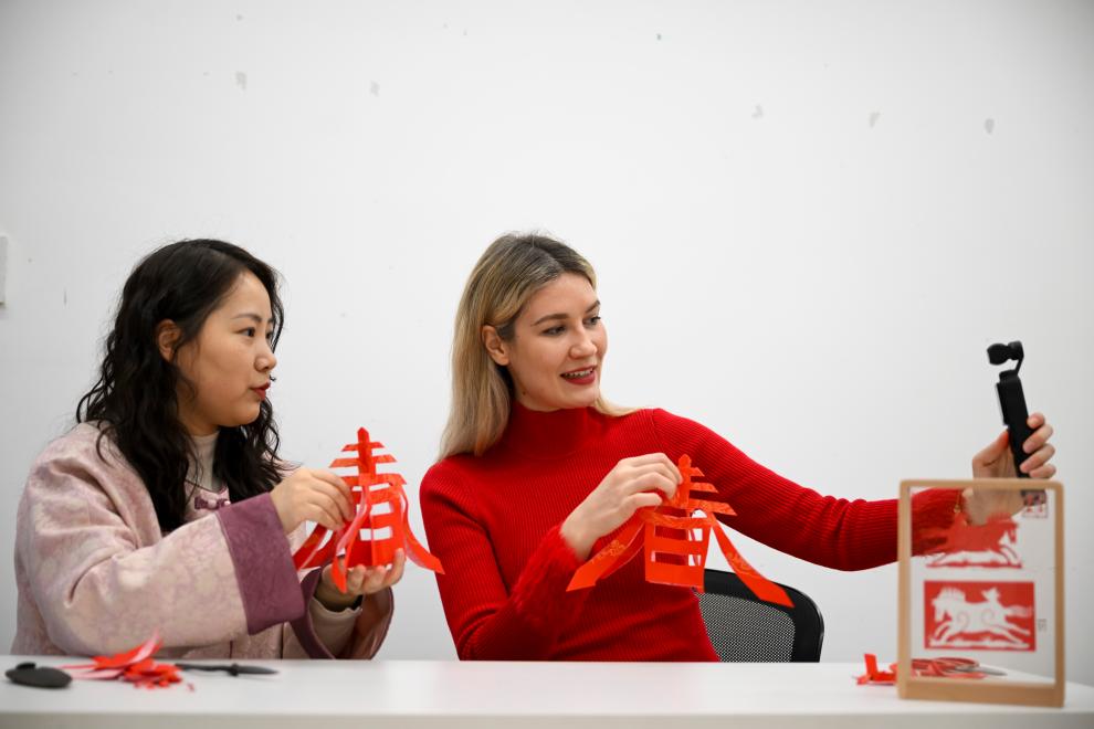 SHANGHAI, 16 febrero, 2026 (Xinhua) -- Imagen del 6 de febrero de 2026 de Aleksandra Antonenko (d), grabando videos cortos sobre la experiencia del corte de papel, en Shanghai, en el este de China. Aleksandra Antonenko se mudó de Rusia para realizar su doctorado en la Universidad Jiao Tong de Shanghai en 2022. También comenzó a mostrar el encanto de la vida cotidiana en China al mundo con videos cortos. (Xinhua/Chen Haoming)
