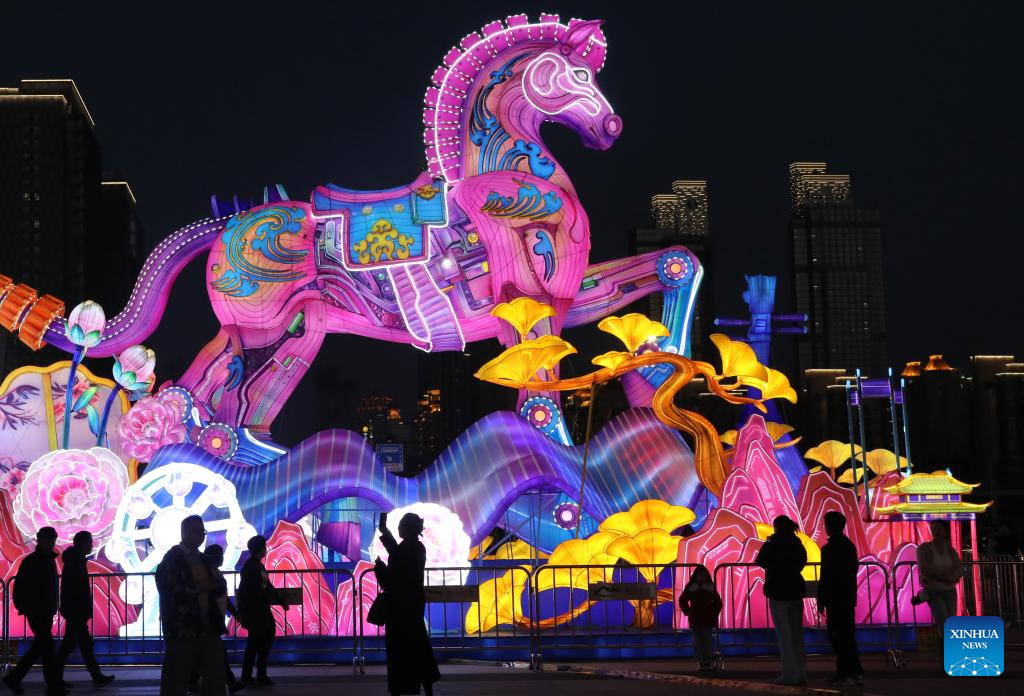BEIJING, 16 febrero, 2026 (Xinhua) -- Imagen del 14 de febrero de 2026 de personas observando una instalación lumínica con temática de caballo, en la Plaza Cultural Shishan, en la ciudad de Suzhou, en la provincia de Jiangsu, en el este de China. (Xinhua/Hang Xingwei)