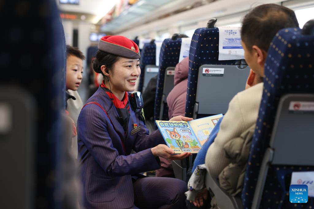 BEIJING, 19 febrero, 2026 (Xinhua) -- Imagen del 18 de febrero de 2026 de una empleada reconfortando a un niño dentro de un tranquilo vagón del tren D2719 que viaja desde Xi'an de la provincia de Shaanxi, en el noroeste de China, a Wuwei, en la provincia de Gansu, en el noroeste de China. Durante la temporada de viajes de la Fiesta de la Primavera, los departamentos de aviación civil, ferrocarriles y otros han aumentado la capacidad de transporte y optimizado servicios convenientes como el transporte intermodal aéreo-ferroviario, vagones silenciosos, entrega de equipaje y canales prioritarios para grupos vulnerables, implementando múltiples medidas para garantizar un viaje seguro y sin contratiempos para los pasajeros. (Xinhua/Liu Xiang)