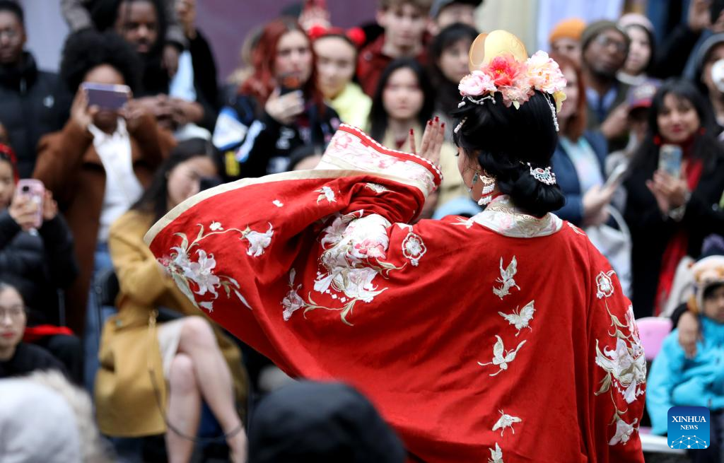 LONDRES, 22 febrero, 2026 (Xinhua) -- Imagen del 21 de febrero de 2026 de personas observando una presentación de trajes tradicionales chinos durante una celebración del Año Nuevo chino, en el Mercado de Camden, en Londres, Reino Unido. (Xinhua/Li Ying)