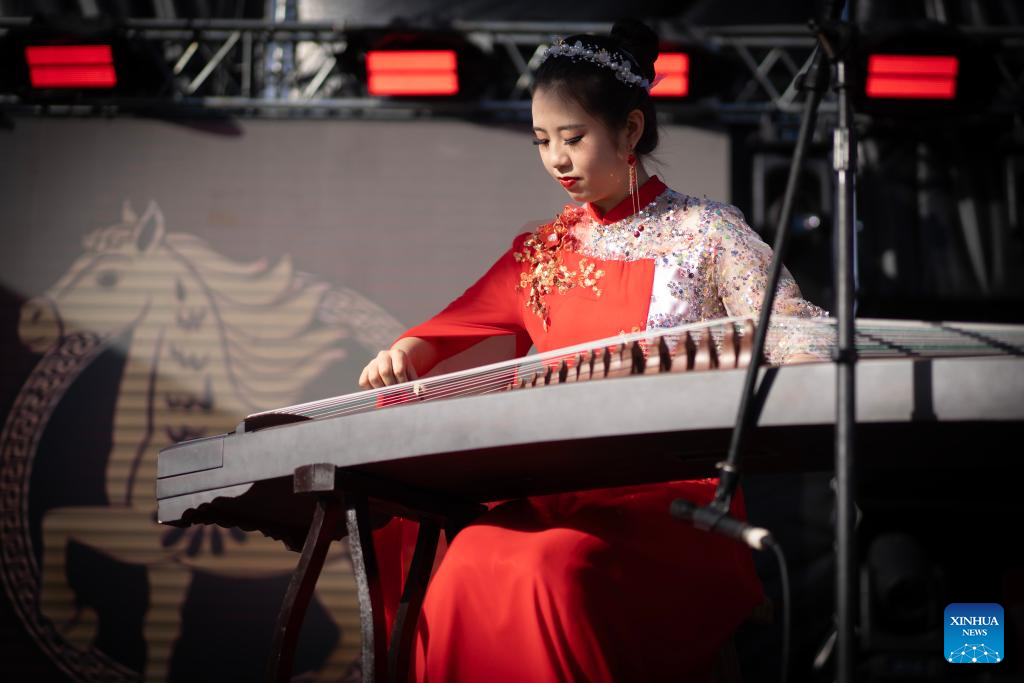 LA PLATA, 22 febrero, 2026 (Xinhua) -- Imagen del 21 de febrero de 2026 de una artista realizando una presentación con un guzheng durante las celebraciones por el Año Nuevo chino en la Plaza Moreno, en la ciudad de La Plata, Argentina. La ciudad argentina de La Plata se sumó el sábado a los festejos por el Año Nuevo chino con un multitudinario y colorido festival frente a la emblemática catedral de la ciudad. (Xinhua/Martín Zabala)