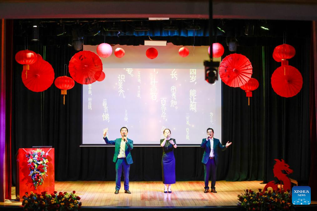 Imagen del 25 de febrero de 2026 de maestros del idioma chino realizando una presentación durante la celebración del Año Nuevo chino organizado por el Instituto Confucio de la Universidad San Francisco de Quito (USFQ), en la ciudad de Quito, capital de Ecuador. El Instituto Confucio de la USFQ celebró la llegada del Año Nuevo chino con un evento cultural que promovió las tradiciones y la riqueza cultural de China, fomentando un ambiente de fraternidad con la comunidad estudiantil ecuatoriana. (Xinhua/Ricardo Landeta)