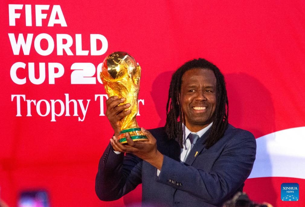 JALISCO, 28 febrero, 2026 (Xinhua) -- El exfutbolista brasileño y campeón mundial, Roque Júnior, levanta el trofeo durante el inicio del Tour del Trofeo de la Copa Mundial de la Federación Internacional de Fútbol Asociación (FIFA), en Zapopan, en la zona metropolitana de Guadalajara, estado de Jalisco, México, el 28 de febrero de 2026. La sexta edición del Tour del Trofeo de la Copa Mundial de la FIFA inició el sábado su recorrido por territorio mexicano en la ciudad de Guadalajara, con la finalidad de acercar a los aficionados al galardón más codiciado del balompié en la antesala del Mundial 2026 que acogerán de manera conjunta México, Estados Unidos y Canadá. (Xinhua/Miriam Jiménez)