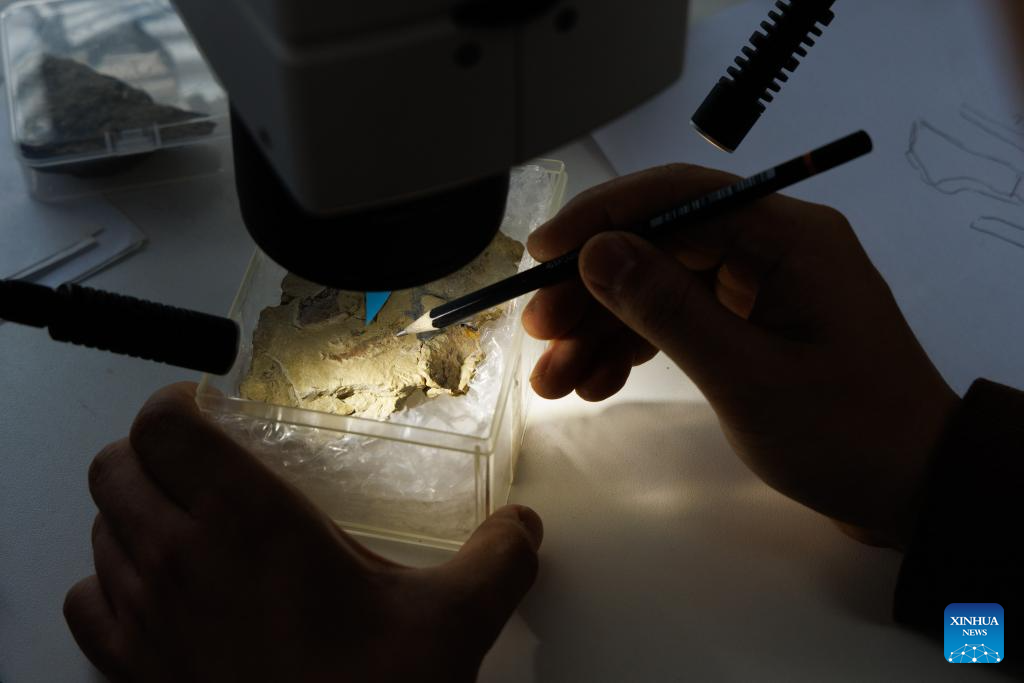 BEIJING, 5 marzo, 2026 (Xinhua) -- Imagen del 3 de marzo de 2026 de Zhu You'an, un investigador del Instituto de Paleontología y Paleoantropología de Vertebrados (IVPP, por sus siglas en inglés) de la Academia de Ciencias de China, estudiando el fósil de Eosteus chongqingensis en el IVPP, en Beijing, capital de China. Los fósiles de dos peces de hace más de 400 millones de años, uno era una diminuta criatura aerodinámica y el otro un gigante entre los vertebrados de su tiempo con dientes extraños, han sido descubiertos en China, llenando un vacío crucial en el proceso evolutivo "de pez a humano". (Xinhua/Jin Liwang)