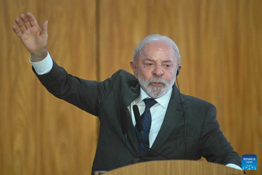 BRASILIA, 9 marzo, 2026 (Xinhua) -- El presidente brasileño, Luiz Inácio Lula da Silva, habla al término de su reunión bilateral con el presidente sudafricano, Cyril Ramaphosa, en el Palacio de Planalto, en Brasilia, Brasil, el 9 de marzo de 2026. (Xinhua/Lucio Tavora)