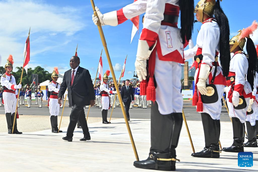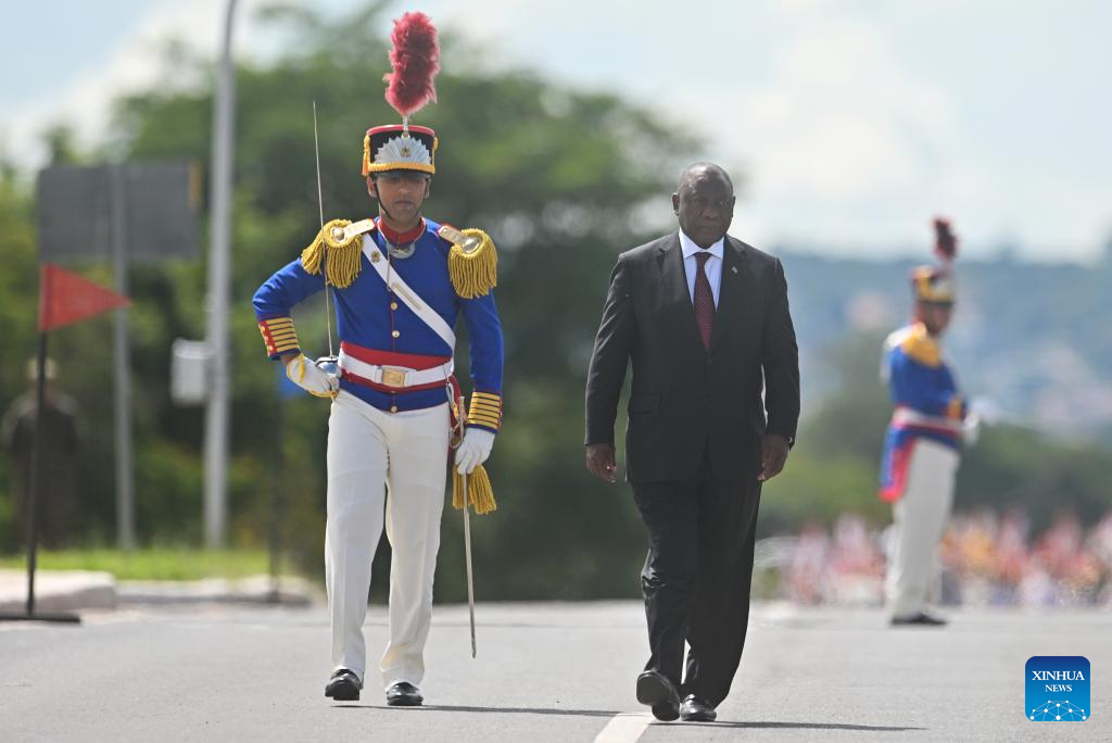 BRASILIA, 9 marzo, 2026 (Xinhua) -- El presidente sudafricano, Cyril Ramaphosa (c), pasa revista a la guardia de honor a su llegada para una reunión con el presidente brasileño, Luiz Inácio Lula da Silva en el Palacio de Planalto, en Brasilia, Brasil, el 9 de marzo de 2026. (Xinhua/Lucio Tavora)