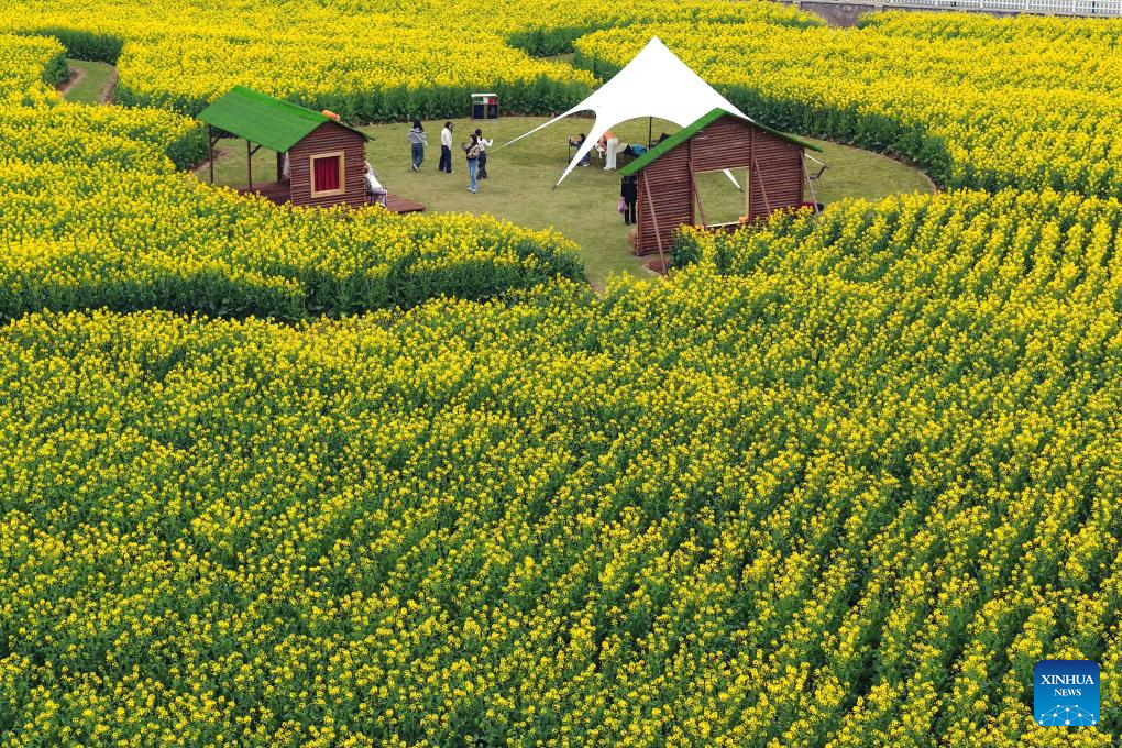 BEIJING, 22 marzo, 2026 (Xinhua) -- Vista aérea tomada con un dron del 21 de marzo de 2026 de personas disfrutando de un banquete en medio de flores de colza, en el poblado de Huaqiao de la ciudad de Guang'an, en la provincia de Sichuan, en el sur de China. Personas salen al aire libre y disfruta de la naturaleza mientras la primavera se extiende por toda China. (Xinhua/Zhang Guosheng)