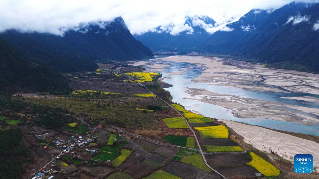 LHASA, 22 marzo, 2026 (Xinhua) -- Vista aérea tomada con un dron el 20 de marzo de 2026 de un campo de flores de colza, en el distrito de Bomi de la ciudad de Nyingchi, en la región autónoma de Xizang, en el suroeste de China. Las flores de colza y durazno están aquí en plena floración, creando una escena pintoresca en la meseta. (Xinhua/Purbu Tsering)