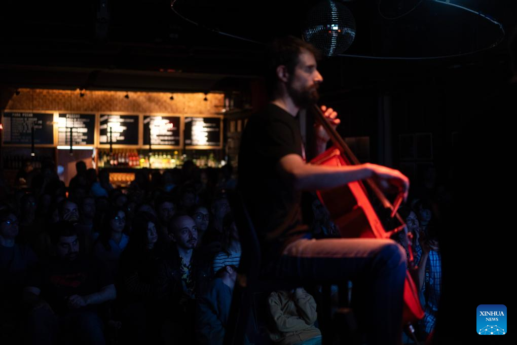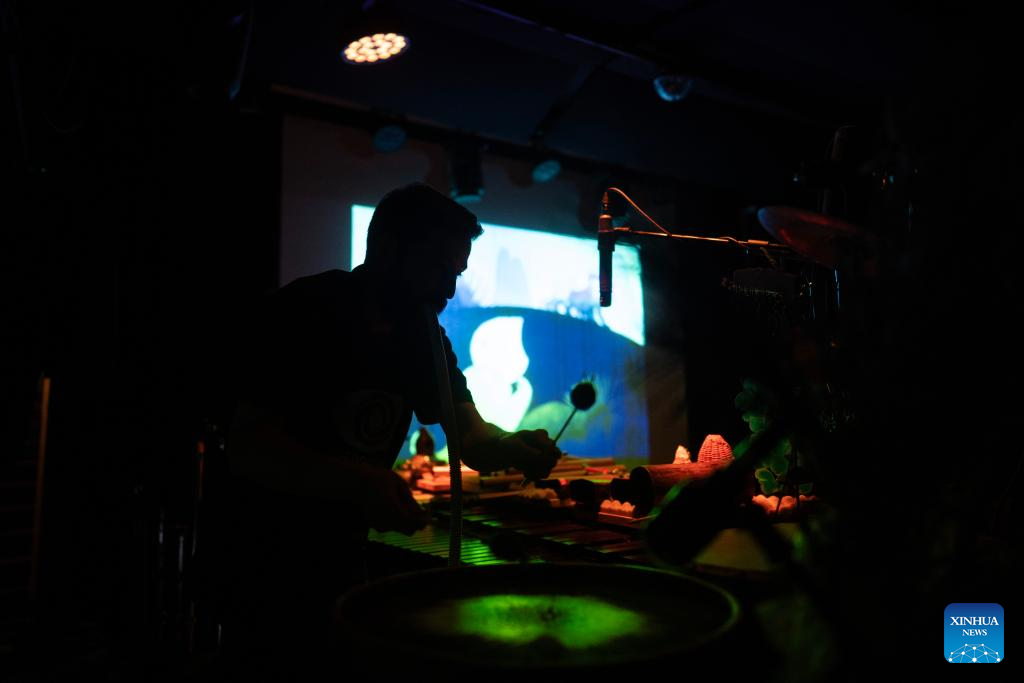 Imagen del 22 de marzo de 2026 de un integrante del grupo Videodromo interpretando música incidental con percusiones durante la proyección del cortometraje animado "Los monos atrapan la luna" del director Zhou Keqin, producido por el Estudio de Animación de Shanghai, en el centro cultural Morán, en la ciudad de Buenos Aires, capital de Argentina. El cine de animación chino de las décadas de los 60 y 80 cautivó el domingo en Buenos Aires la atención del público en un vibrante encuentro que fusionó la poesía y narrativa visual del país asiático con la composición sonora de músicos argentinos. (Xinhua/Martín Zabala)