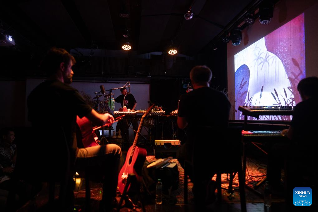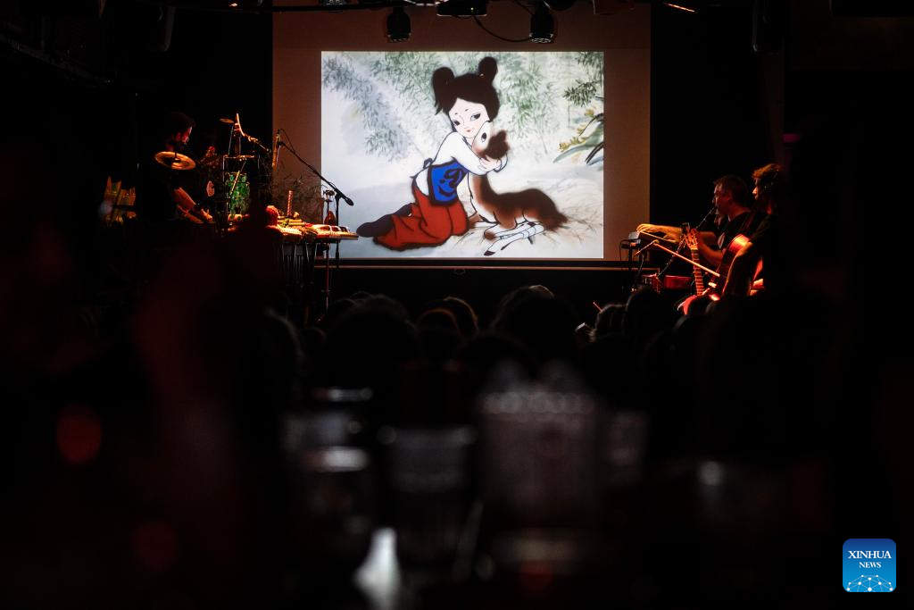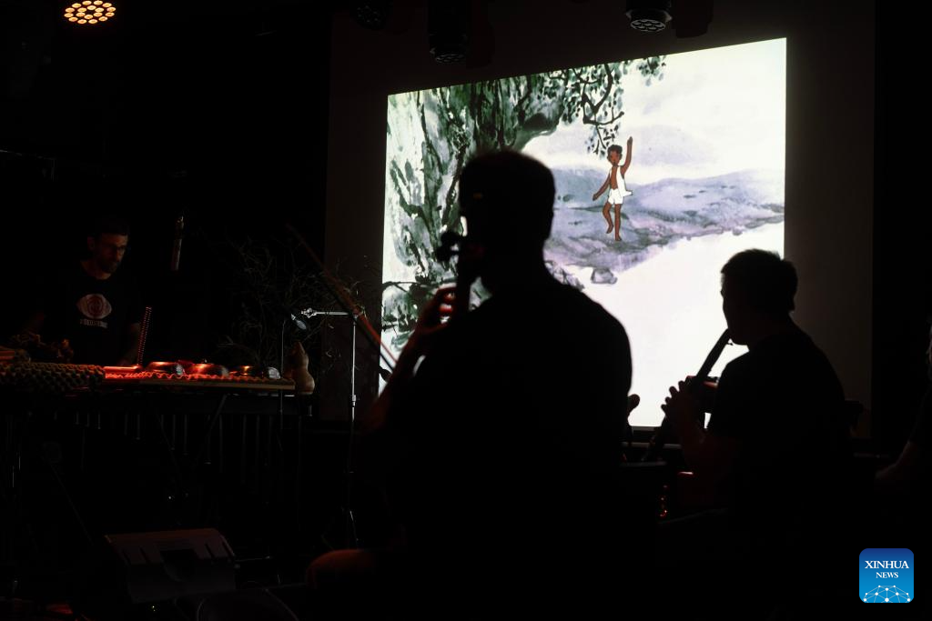 Imagen del 22 de marzo de 2026 de integrantes del grupo Videodromo interpretando música incidental durante la proyección del cortometraje animado "La campana del ciervo" de los directores Wu Qiang y Tang Cheng, producido por el Estudio de Animación de Shanghai, en el centro cultural Morán, en la ciudad de Buenos Aires, capital de Argentina. El cine de animación chino de las décadas de los 60 y 80 cautivó el domingo en Buenos Aires la atención del público en un vibrante encuentro que fusionó la poesía y narrativa visual del país asiático con la composición sonora de músicos argentinos. (Xinhua/Martín Zabala)