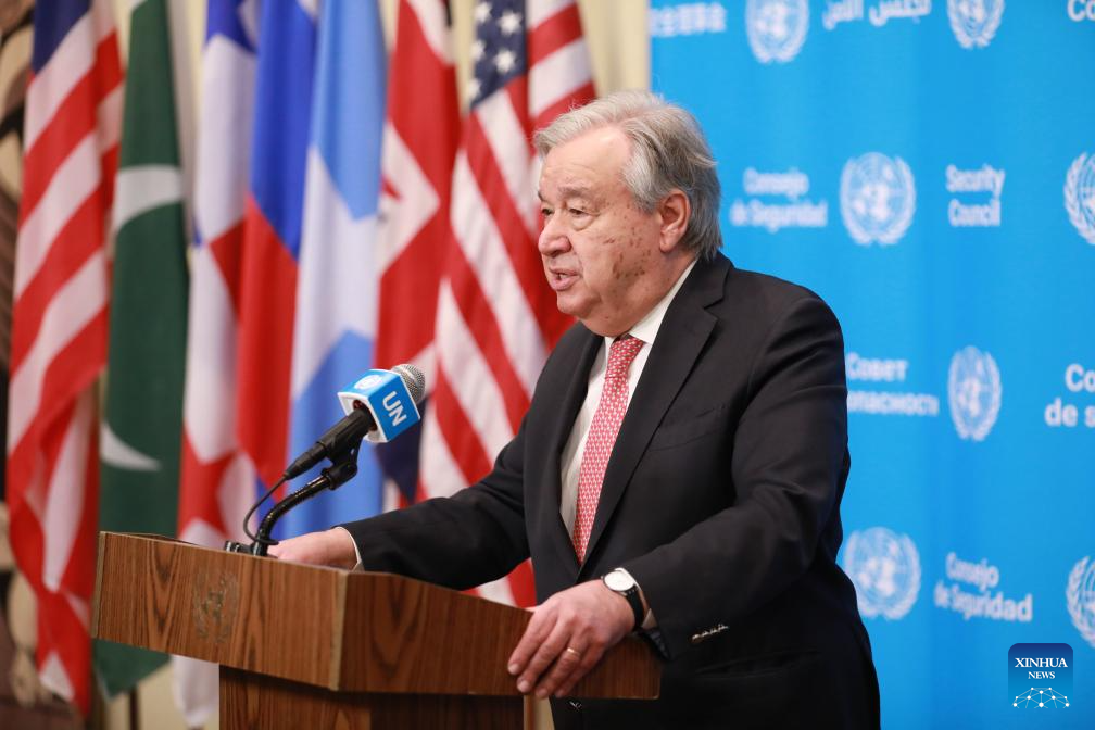 NACIONES UNIDAS, 2 abril, 2026 (Xinhua) -- El secretario general de la ONU, António Guterres (i), habla ante la prensa en la sede de la ONU, en Nueva York, el 2 de abril de 2026. Guterres reiteró el jueves su llamado a Estados Unidos e Israel para detener la guerra contra Irán, y a Irán para que suspenda los ataques contra sus vecinos. (Xinhua/Xie E)