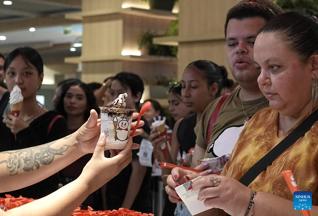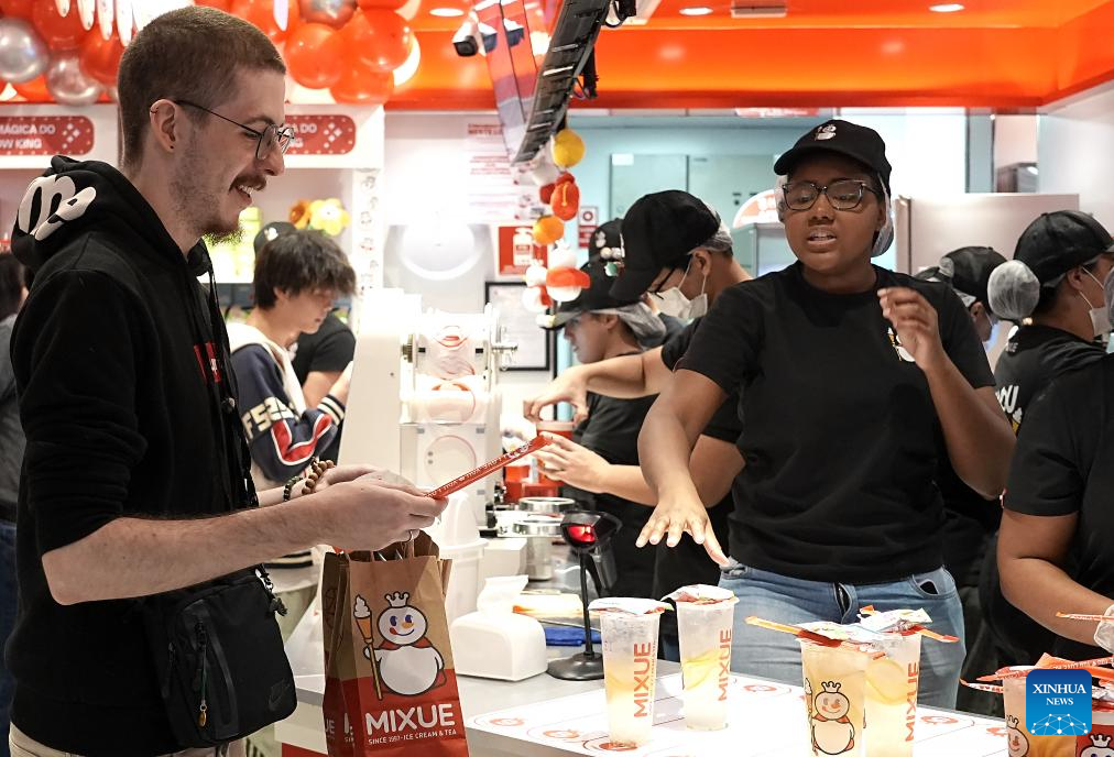SAO PAULO, 11 abril, 2026 (Xinhua) -- Clientes degustan productos en la primera tienda china Mixue en Brasil durante su inauguración en un centro comercial, en Sao Paulo, Brasil, el 11 de abril de 2026. Mixue abrió su primera tienda en Brasil y según un representante de la empresa también comenzará la construcción de una fábrica para su cadena de suministro en el país. Se espera que genere 25.000 empleos en el futuro. (Xinhua/Paulo Lopes)