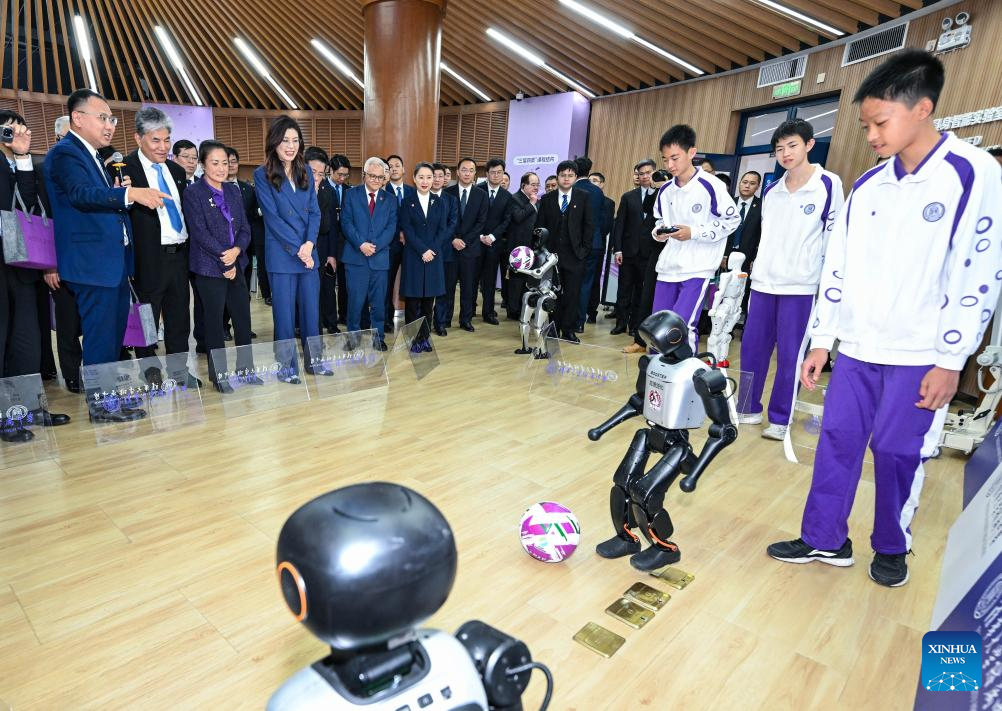 La primera parada de la delegación fue la Escuela Secundaria de la Universidad Tsinghua, donde conocieron sobre la aplicación de la IA en la enseñanza. En los laboratorios escolares, la delegación observó proyectos desarrollados por los estudiantes, incluyendo partidos de fútbol con robots, perros robóticos y brazos robóticos.