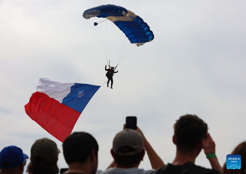 SANTIAGO, 13 abril, 2026 (Xinhua) -- Imagen del 12 de abril de 2026 de un visitante observando una presentación de paracaidismo en la Feria Internacional del Aire y del Espacio (FIDAE) 2026, en Santiago, capital de Chile. La FIDAE 2026 finalizó aquí el domingo. (Xinhua/Zhou Jiayi)