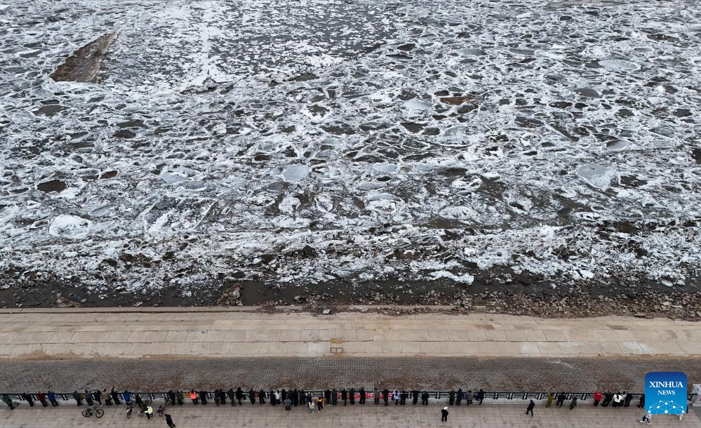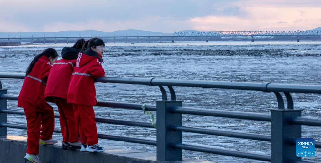 HARBIN, 14 abril, 2026 (Xinhua) -- Imagen del 13 de abril de 2026 de niños disfrutando de la vista del hielo a la deriva que flota en la sección de Jiamusi del río Songhua, en la provincia de Heilongjiang, en el noreste de China. Gran cantidad de hielo flota sobre la superficie del río Heilongjiang y el río Songhua recientemente debido al aumento de la temperatura. (Xinhua/Zhu Zongqiang)