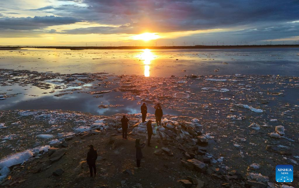 HARBIN, 14 abril, 2026 (Xinhua) -- Vista aérea tomada con un dron el 13 de abril de 2026 de personas disfrutando de la vista del hielo a la deriva que flota en la sección Fujin del río Songhua, en la provincia de Heilongjiang, en el noreste de China. Gran cantidad de hielo flota sobre la superficie del río Heilongjiang y el río Songhua recientemente debido al aumento de la temperatura. (Xinhua/Qu Yubao)