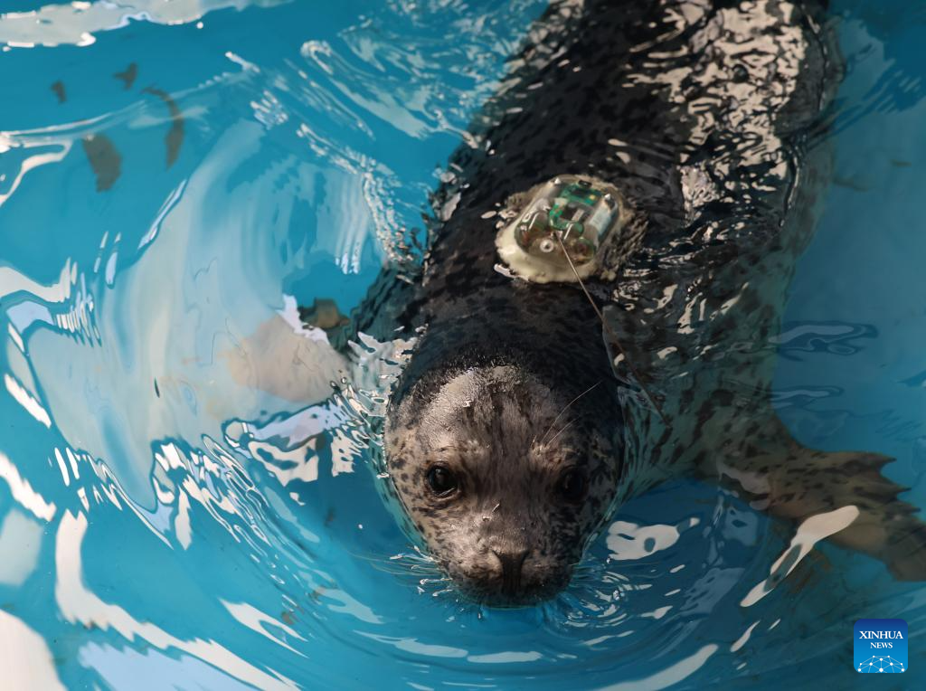 DALIAN, 16 abril, 2026 (Xinhua) -- Imagen del 15 de abril de 2026 de una foca manchada, con una etiqueta de seguimiento y localización en el lomo, nadando en una piscina antes de ser liberada en el Instituto de Investigación de Ciencias Oceánicas y Pesqueras de Liaoning, en Dalian, en la provincia de Liaoning, en el noreste de China. Cinco focas manchadas fueron liberadas el jueves en aguas frente a la costa de Dalian. Tres de ellas fueron rescatadas y rehabilitadas por el Instituto de Investigación de Ciencias Oceánicas y Pesqueras de Liaoning, mientras que las otras dos fueron criadas artificialmente por Sunasia Ocean World en Dalian. (Xinhua/Han He)
