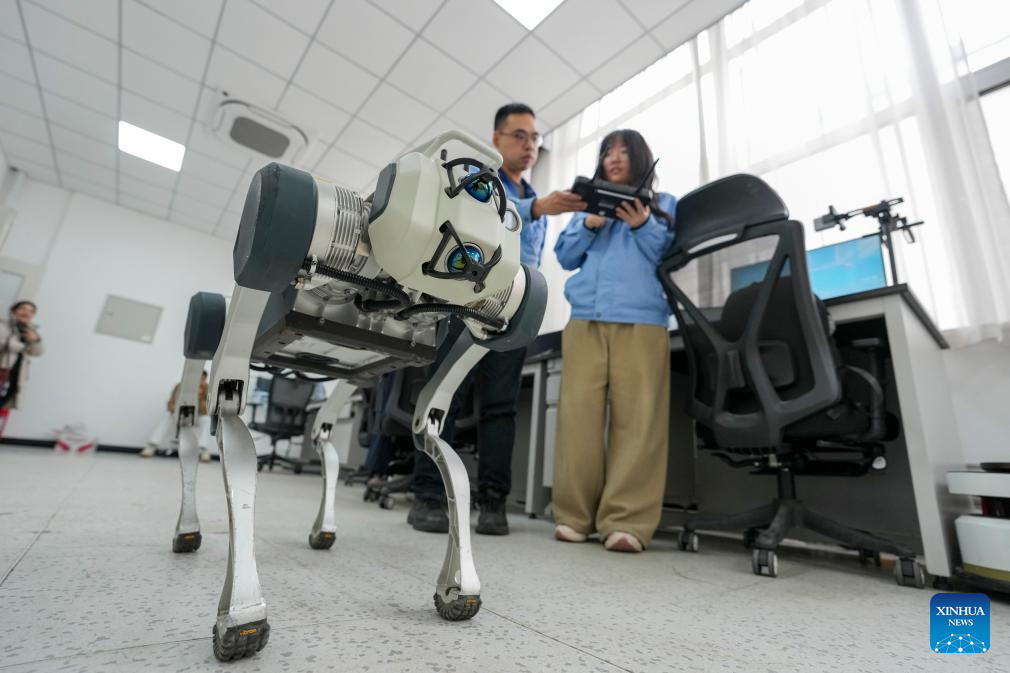 HARBIN, 16 abril, 2026 (Xinhua) -- Imagen del 15 de abril de 2026 de técnicos probando un perro robot utilizado para el control de calidad en la logística ferroviaria en una base experimental de China Railway Harbin Group of Technology Corp., en Harbin, en la provincia de Heilongjiang, en el noreste de China. Las autoridades ferroviarias de Harbin han desplegado diversos tipos de equipos tecnológicos inteligentes y no tripulados para satisfacer las necesidades de transporte de mercancías, garantizando la entrega eficiente de insumos agrícolas de primavera y cereales. (Xinhua/Wang Song)