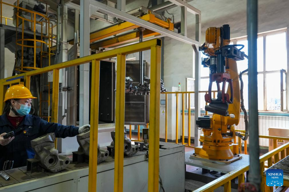 HARBIN, 16 abril, 2026 (Xinhua) -- Imagen del 15 de abril de 2026 de un robot llevando a cabo trabajo de mantenimiento en un taller de China Railway Harbin Bureau Group Co., Ltd., en Harbin, en la provincia de Heilongjiang, en el noreste de China. Las autoridades ferroviarias de Harbin han desplegado diversos tipos de equipos tecnológicos inteligentes y no tripulados para satisfacer las necesidades de transporte de mercancías, garantizando la entrega eficiente de insumos agrícolas de primavera y cereales. (Xinhua/Wang Song)