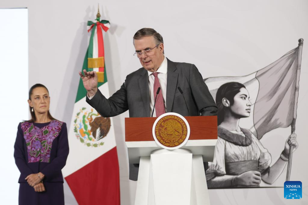 CIUDAD DE MEXICO, 16 abril, 2026 (Xinhua) -- El secretario de Economía mexicano, Marcelo Ebrard (frente), habla durante la conferencia de prensa matutina de la presidenta mexicana, Claudia Sheinbaum (atrás), en Palacio Nacional, en la Ciudad de México, capital de México, el 16 de abril de 2026. Ebrard anunció el jueves una inversión por 1.000 millones de dólares por parte de la empresa Flex destinada a fortalecer la producción de equipos para centros de datos y aplicaciones de inteligencia artificial en el país. (Xinhua/Francisco Cañedo)