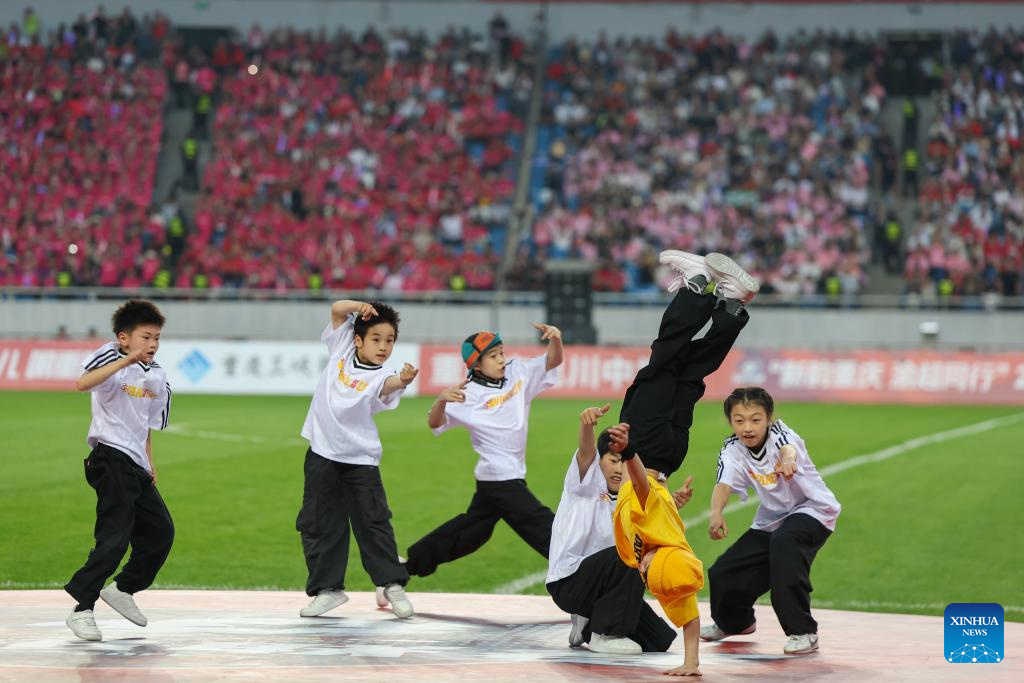 CHONGQING, 17 abril, 2026 (Xinhua) -- Imagen del 12 de abril de 2026 de Li Yongqiu (c) realizando una presentación previo al partido final de Liga de fútbol de la ciudad de Chongqing, en Chongqing, en el suroeste de China. Li Yongqiu, un niño chino de 13 años, obtuvo la medalla de oro en el "Junior Dance Tour" en las Finales Mundiales de "Juste Debout 2026" en París, Francia, el 8 de marzo de 2026, haciendo historia. Durante la final, Li presentó una rutina especial en la que combinó movimientos de breakdance con kung fu. (Xinhua/Huang Wei)