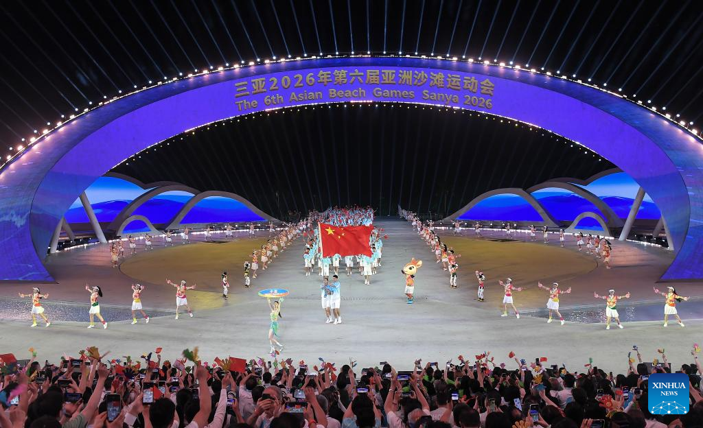 SANYA, 22 abril, 2026 (Xinhua) -- Integrantes de la delegación de China desfilan durante la ceremonia de apertura de los VI Juegos Asiáticos de Playa, en Sanya, en la provincia de Hainan, en el sur de China, el 22 de abril de 2026. (Xinhua/Zhao Yingquan)