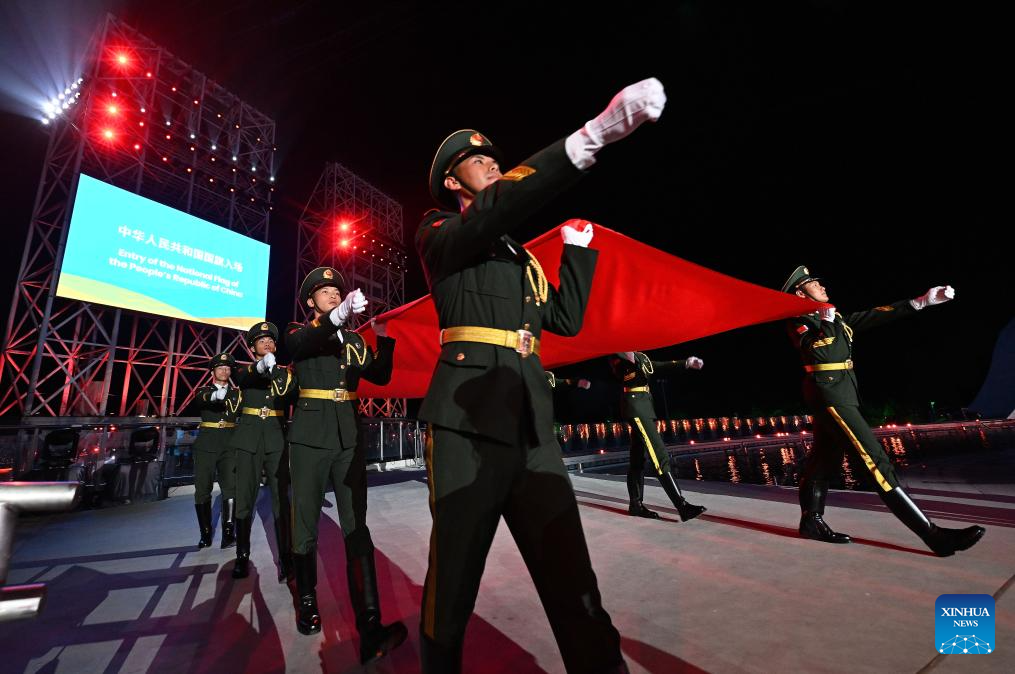 SANYA, 22 abril, 2026 (Xinhua) -- La bandera nacional china es trasladada durante la ceremonia de apertura de los VI Juegos Asiáticos de Playa, en Sanya, en la provincia de Hainan, en el sur de China, el 22 de abril de 2026. (Xinhua/Bei He)
