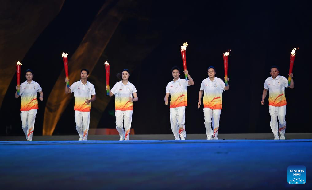 SANYA, 22 abril, 2026 (Xinhua) -- Portadores de antorcha corren con las antorchas durante la ceremonia de apertura de los VI Juegos Asiáticos de Playa, en Sanya, en la provincia de Hainan, en el sur de China, el 22 de abril de 2026. (Xinhua/Zhao Zishuo)