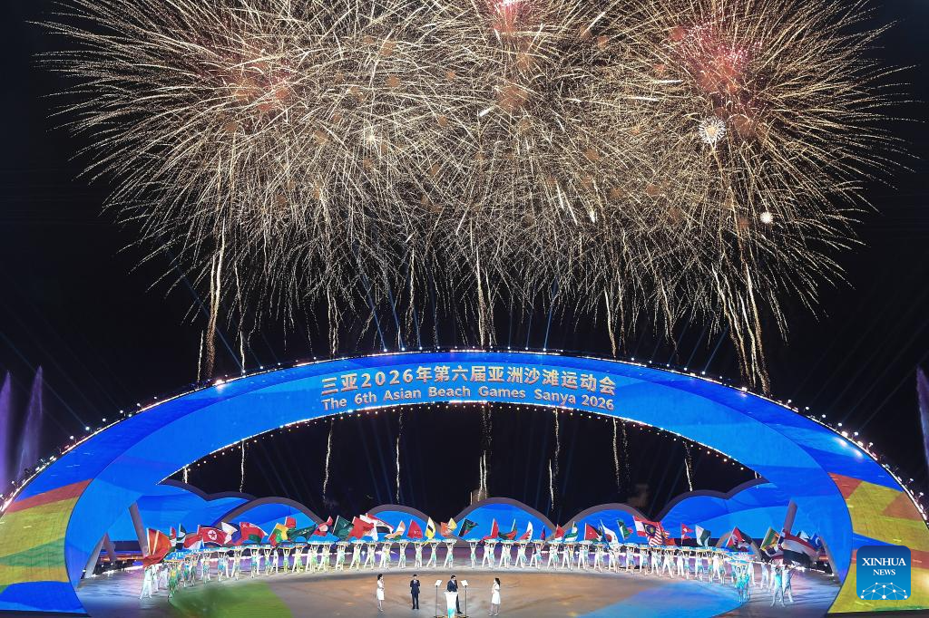 SANYA, 22 abril, 2026 (Xinhua) -- Fuegos artificiales estallan durante la ceremonia de apertura de los VI Juegos Asiáticos de Playa, en Sanya, en la provincia de Hainan, en el sur de China, el 22 de abril de 2026. (Xinhua/Zhao Yingquan)